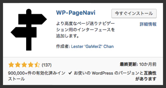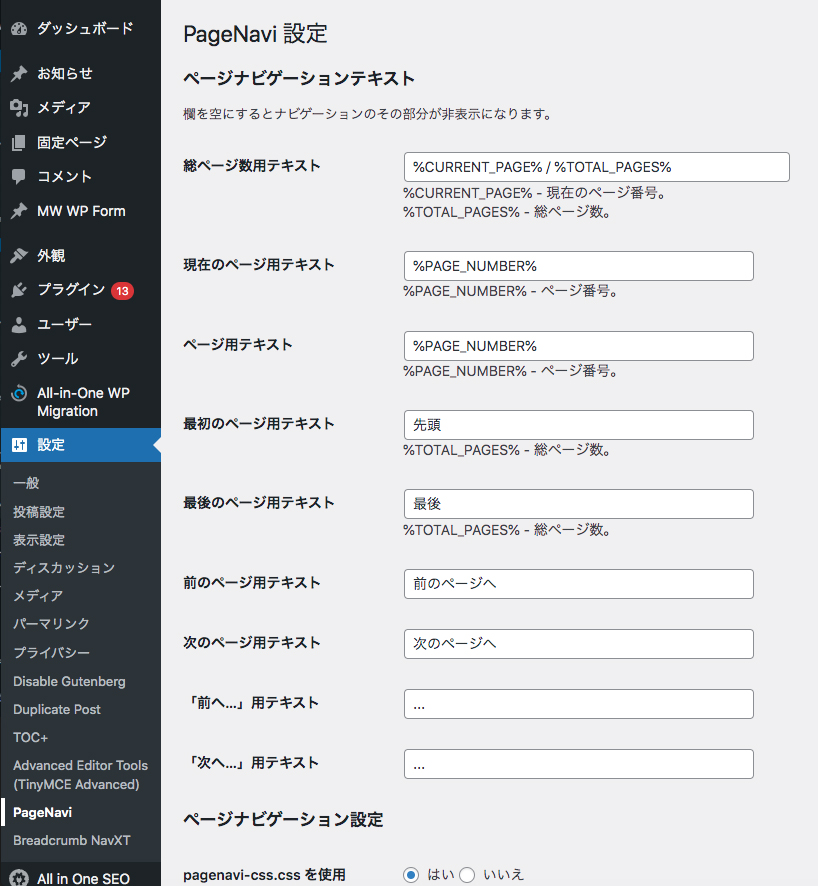 管理画面の「設定」→「PageNavi」で表示設定をする。