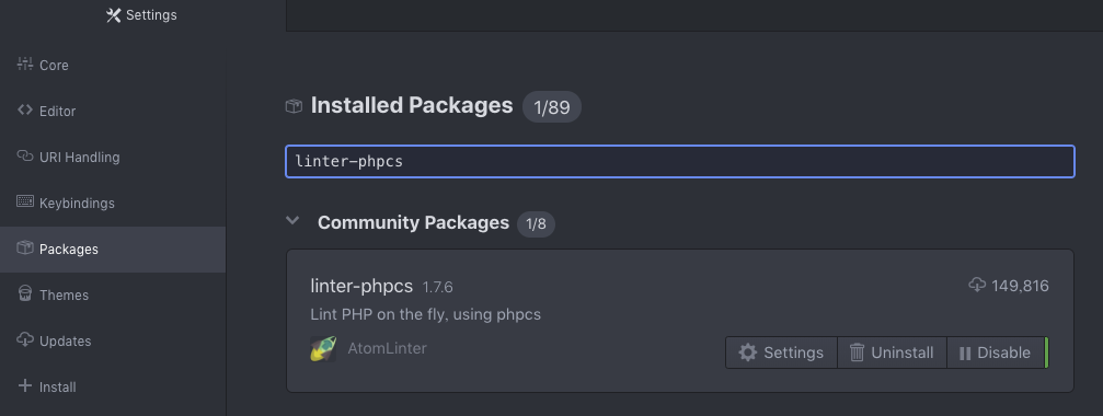 Atom > Preferences > Packages から「linter-phpcs」をインストールします。