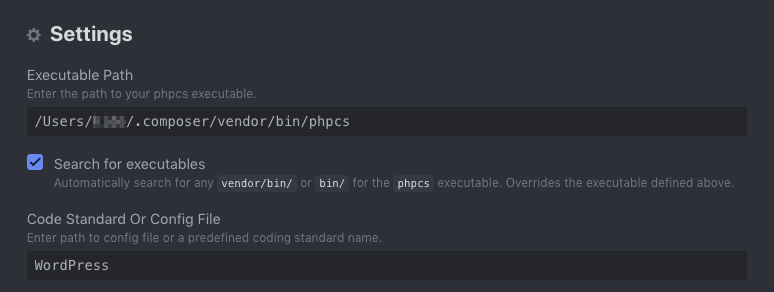 Executable Path は上記でコピーした phpcs の実行パスを入れます。
