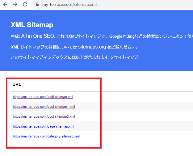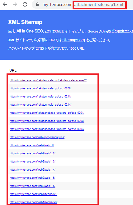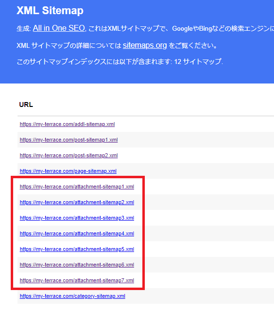 プラグインAll In One SEO(以下、AIOSEO)が出力するXML Sitemapですが、ここにある「attachment-sitemap.xml」というファイルは、全て画像だけのインデックスを指示する内容になっています。