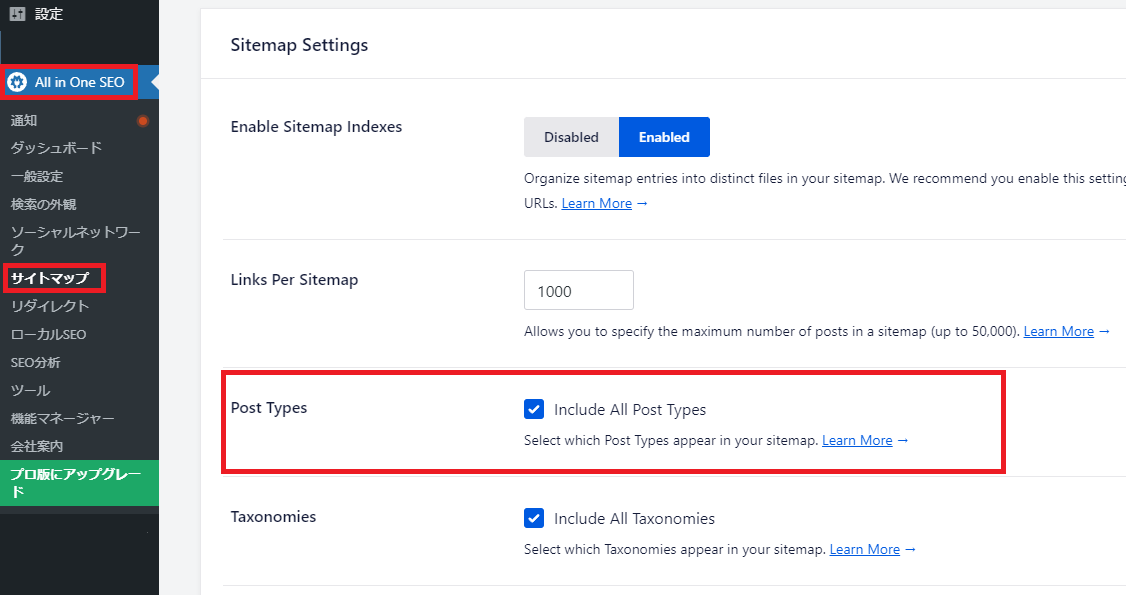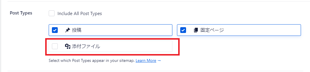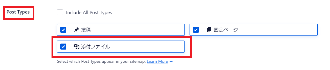 ページ内にあるPost Typesの項目のうち、「Include All Post Types」というチェックボックスをクリック、